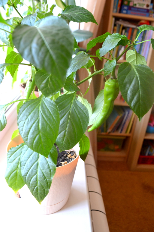 Ну и мой огород,дает свои плоды-с "домашней" плантации съели 5 огурцов,4 мини-помидорки и вот 2 перца,ждут своего часа))Все вкусное и сладенькое.