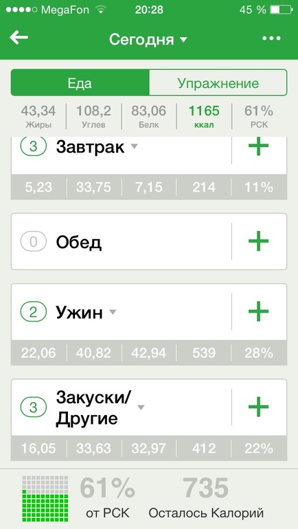 3приема пиши - 2 основных получилось- 1 перекус: каша+кофе, сыр и творожная запеканка+ домашний квас и ужин тушеные овощи и минтай на гриль сковороде без масла. А итог всего 61% рск :( при этом я вешу 79 кг и рост 172 см, вторые роды год назад (разница между детьми 2,6, первое гв 1,10) и месяц как закончила гв. Физических упражнений как таковых нет, но целый день на ногах с детьми. Может вес и объемы стоять из за такого питания? И еще, я бы не сказала что я сытая в итоге за сегодня :( хотя специально не голодаю. Вообще желаемый (в моих мечтах) вес 65кг... Критику адекватно воспринимаю. Понимаю что красивое стройное тело это работа, которой у меня не хватает :)