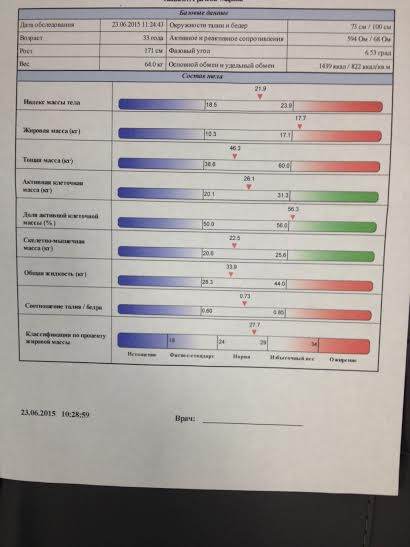 Норма жира для меня 10,3-17,1. А у меня 17,7. Поэтому еще худеть и худеть. Но зато неплохое соотношение талия/бедра 0,73. Врач сказал, что в идеале для женщин 0,75.