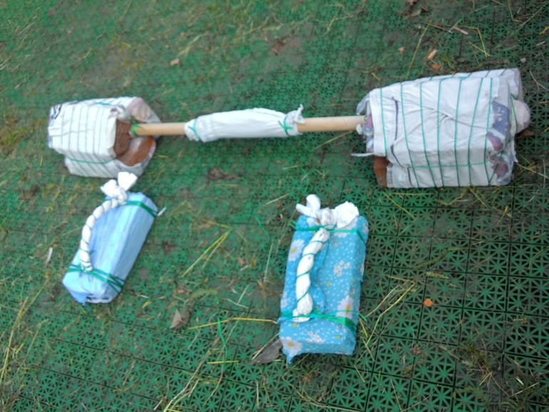 На палку намотана тряпка,потом обложена кирпичами,чтоб не скользили.Еще тряпка сверху,потом слой веревки.И еще слой тряпки и слой веревки))