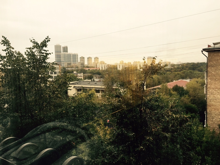 Фото из кухни (вертикальные полоски - это не грязь на окнах, а отражение кисеи :))). Слева - городской пейзаж (вдали - строящийся уже 10 лет ЖК "Триколор")