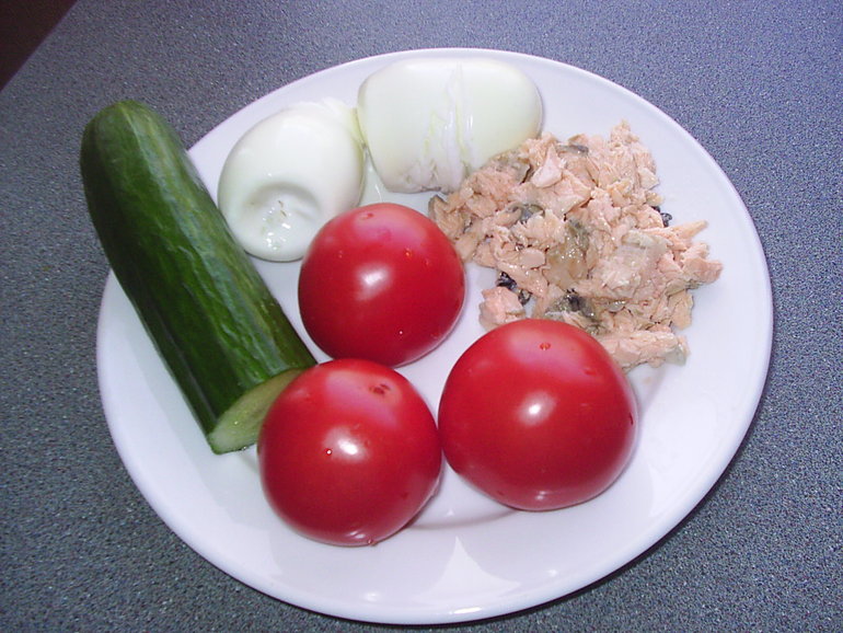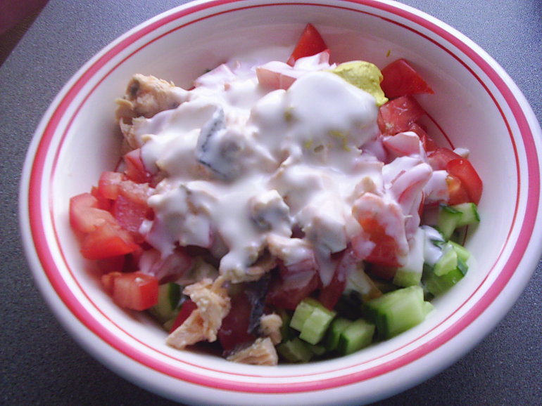Всё режем и заправляем горчицей с кефиром, вкусно получается как с майонезом. И вот эту тарелочку едим целый день, и пьём воду, чай.