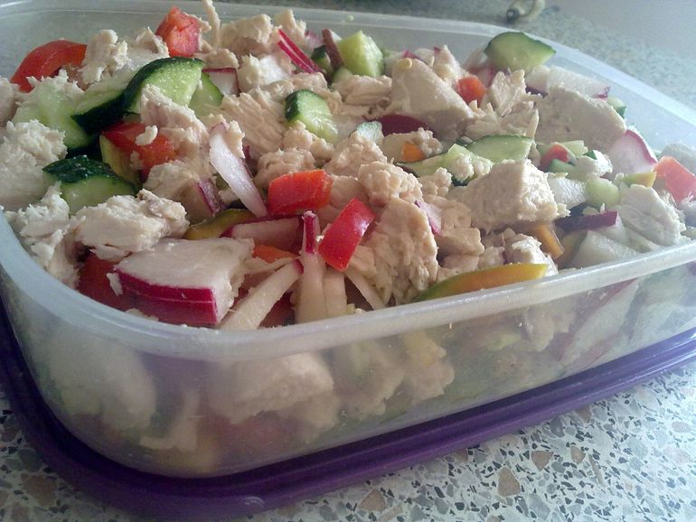 ЗОЖ и ППМеня спасает заранее заготовленный вот такой большой контейнер .Состав : 2 целые курогруди, 2 огурца, 2 перца, 3 редиса, масло олив. Можно добавить яйцо ,пекинскую капусту,яблочко + отдельно помидоры, и ломтик хлеба ц/з.