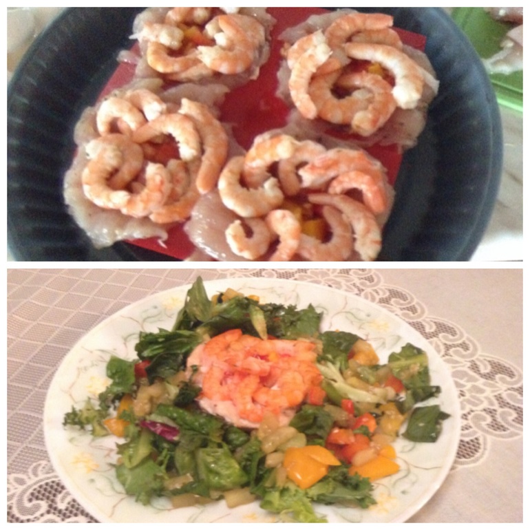 Корзинки из куриной грудки с креветками, внутри белок, помидоры и перец болгарский.