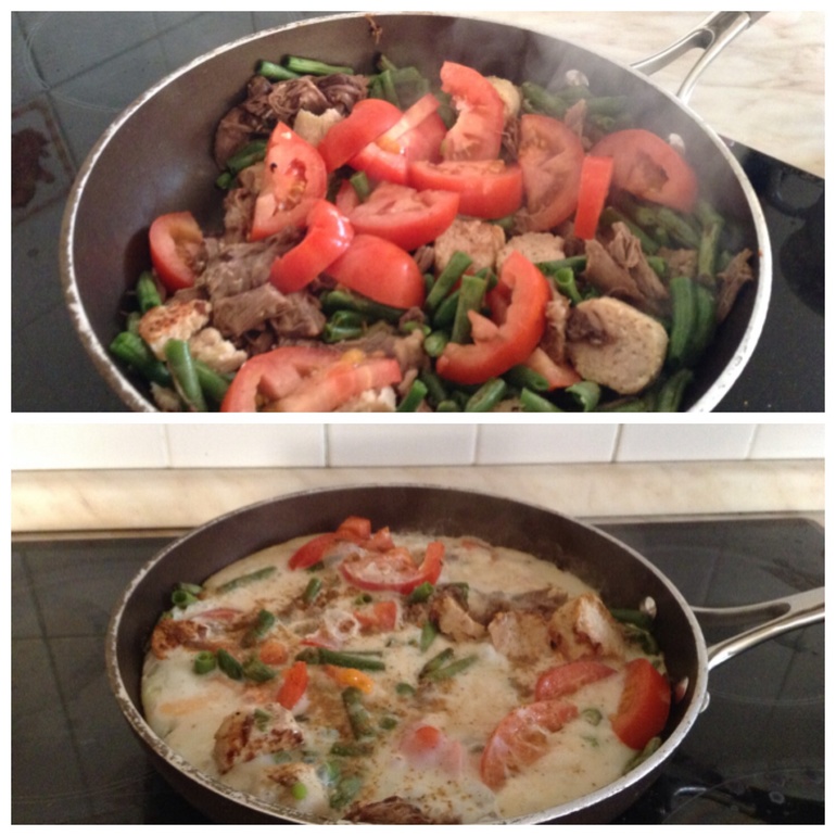 Завтрак: сытный омлет из белков со стручковой фасолью, домашними сосисками из кур грудки, остатки тушеной говядины и помидорами!!! Вкуснооо!