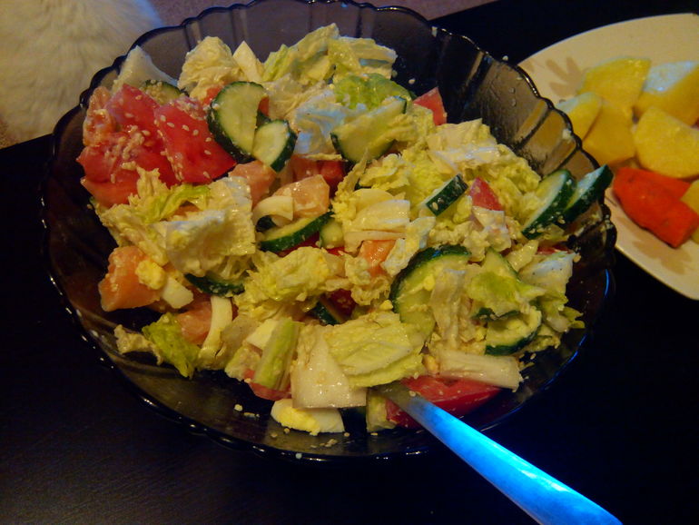 (Треску тушу, переворачиваю и посыпаю луком и приправой, готовлю под крышкой пока не дойдет лук; салат - пекинка, огурцы, перец)