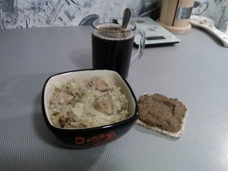 20.30 тушеная капуста с мясом+хлебец с чечевичной икрой+цикорий