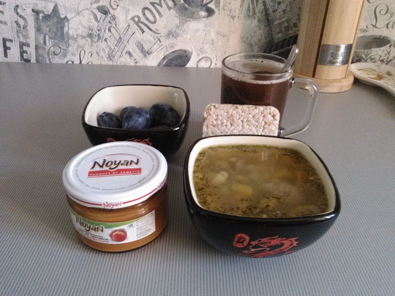 15.30 суп с фрикадельками+сливы+хлебец с персиковым пюре+кофейный напиток