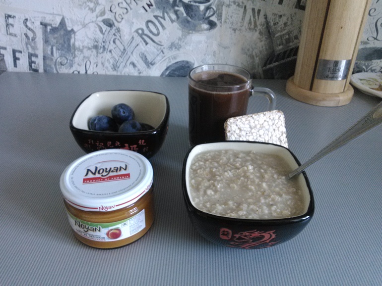10.00 овсянка+сливы+хлебец с персиковым пюре+какао