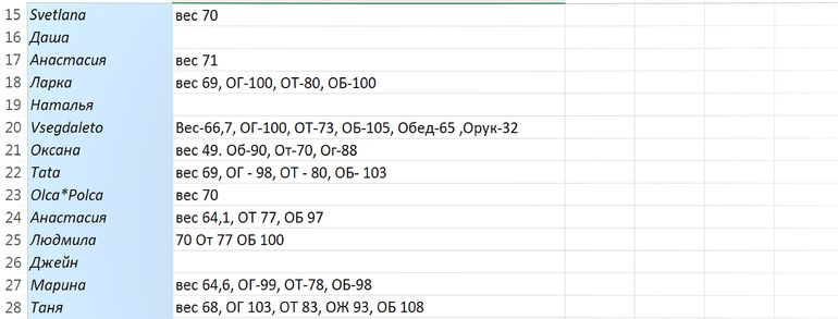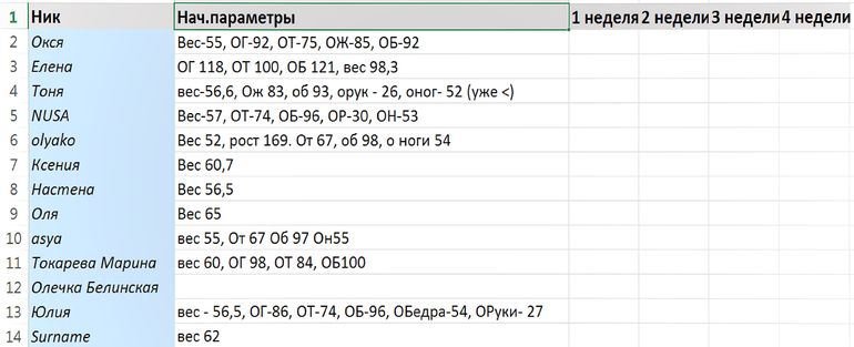 Да-да, нас целых 38 человек)) Надеюсь до конца дойдем почти все)) Если вдруг кто себя не нашел, увидел ошибку или что-то еще, пишите мне. Табличку делала вчера ночью, так что кто не прислал мне свои параметры виноваты сами, теперь впишу их через неделю, извиняйте)