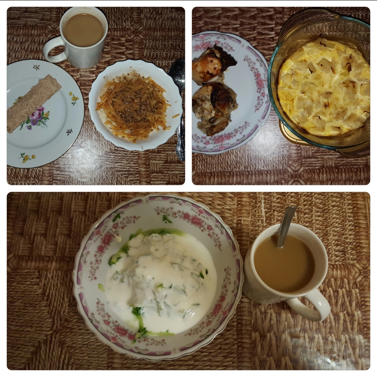 Примерное меню. Ужины всегда творог либо рыба. Обед овощи курица. На данном фото капуста запеченая с белком. Завтраки каша с фруктами семена льна. Хлебец с икрой минтая.