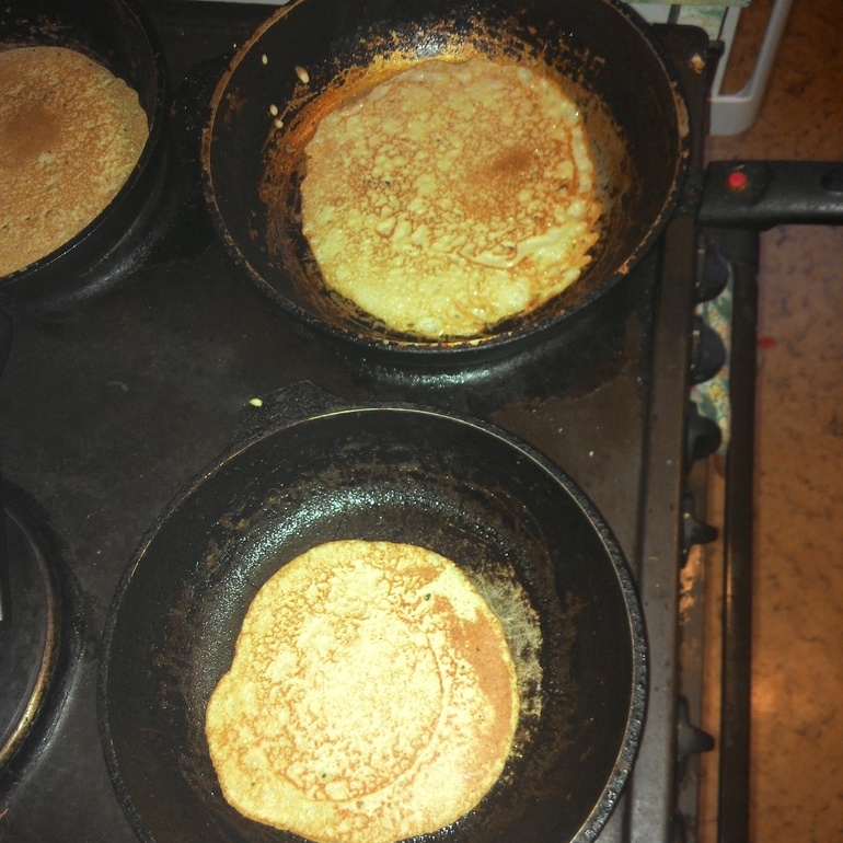Вчера мама приехала и привезла купленные жареные пирожки с картошкой.Жирнющие,все в масле.Я глягула на него и у меня даже поджелудочная сжалась от ужаса))))Я поняла,что не просто его не хочу,я его боюсь!))).Часто готовлю себе отдельно.Вот и сегодня у семьи на полдник блины классические(на верхних двух сковородах) - мука,яйца,молоко,дрожжи,соль,сахар.