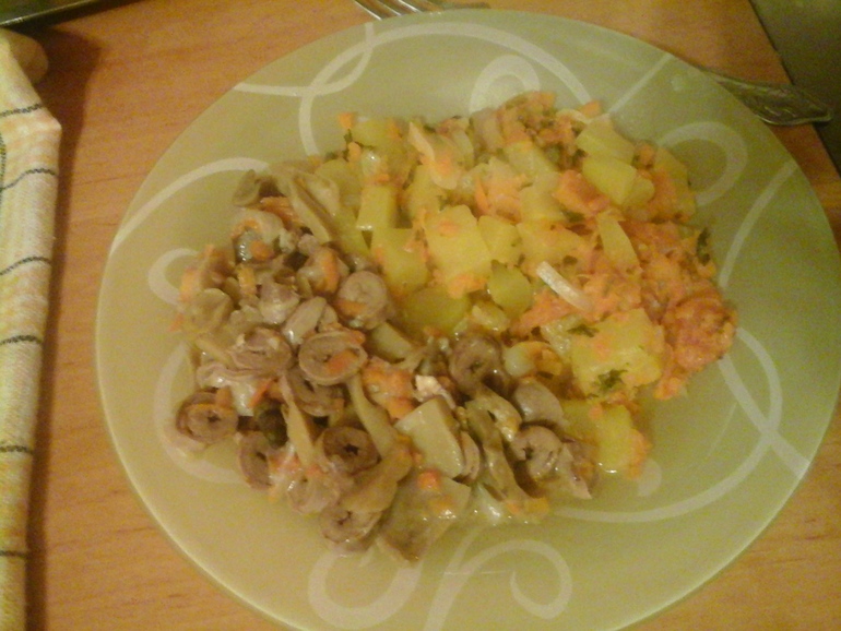 Итак, потушить лучок и морковь, добавить сердечки и шампиньоны , тушить с водичкой до готовности, на гарнир овощи тушеные + свежий салат.