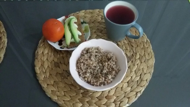 Гречка с чайной ложкой меда, хлебец с половинкой белка и авокадо, хурма, малиновый чай: 419/10.7/5.4/76.5)))))