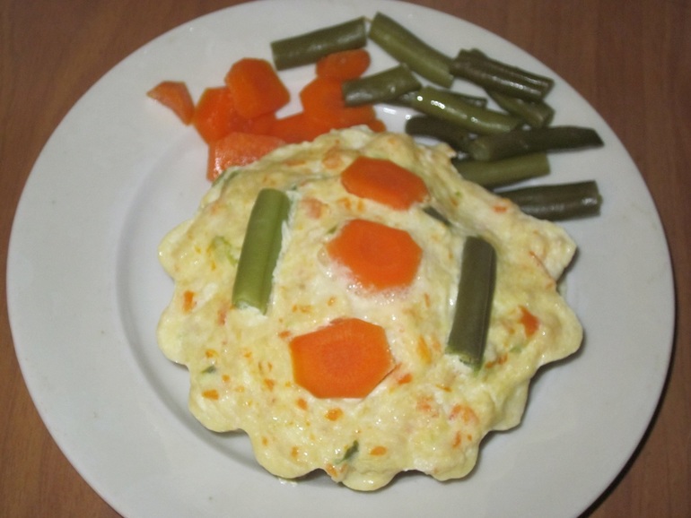 Рыбное суфле с овощами (рыбка + овощи в блендер + яйцо + соль) перемешать и выложить в формочку , готовить на пару или в духовке