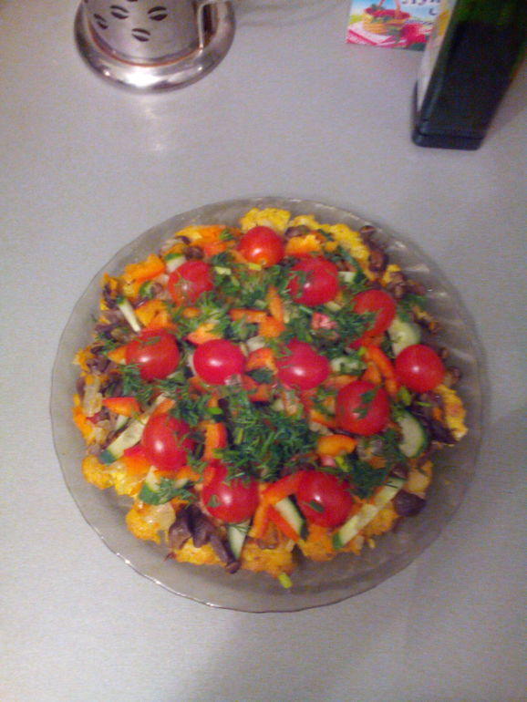 рецепт: основа: кур.филе+ специи и яйцо в блендере и на сковороде чуток олив.масла. начинка: грибы опята домашние сваренные+ лук и морк. Перетушино, свежий огурец, болг.перец, помидор черри, зелень. Приятного аппетита.