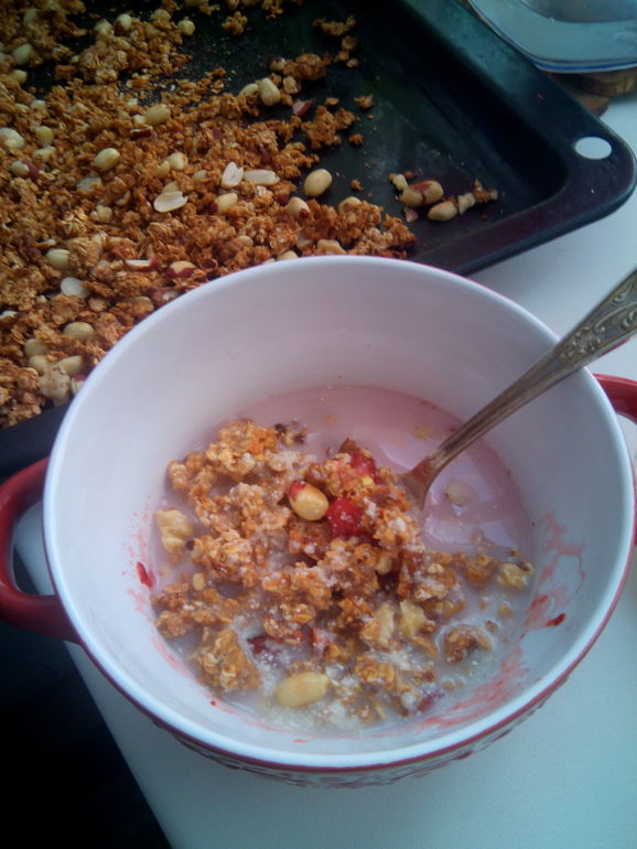 Все перемешиваем, выкладываем на противень и запекаем 30 мин при 160гр. За 10 мин до конца добавлчем орешки-семечки. Периодически перемешиваем. Утром размораживаю любую разрешенную ягоду и ем с ореховым молочком!