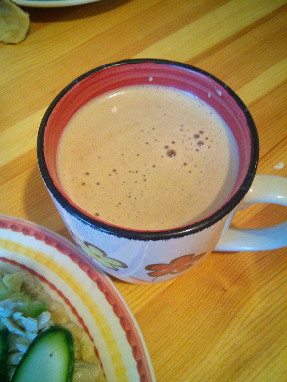 Итак, насыпаем в стакан для погружного блендера кунжут на 2 пальца, немного воды и хорошенько взбиваем. Для сладости можно добавить фитпарад или курагу в недиетные дни. Доливаем воды, процеживаем(я не процеживала). В итоге у меня получилось примерно пол литра. На фото цикорий с этим молочком)) ням-ням.