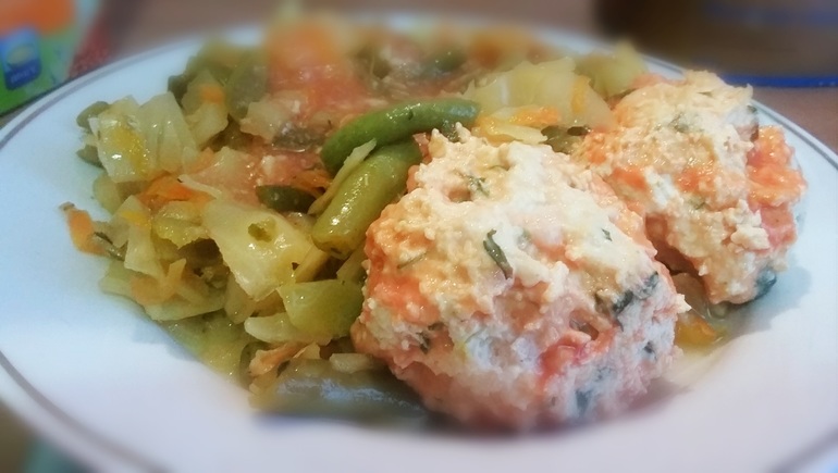 капуста тушеная с фасолью и овощами 150 гр + куринно-творожные тефтельки 80 гр