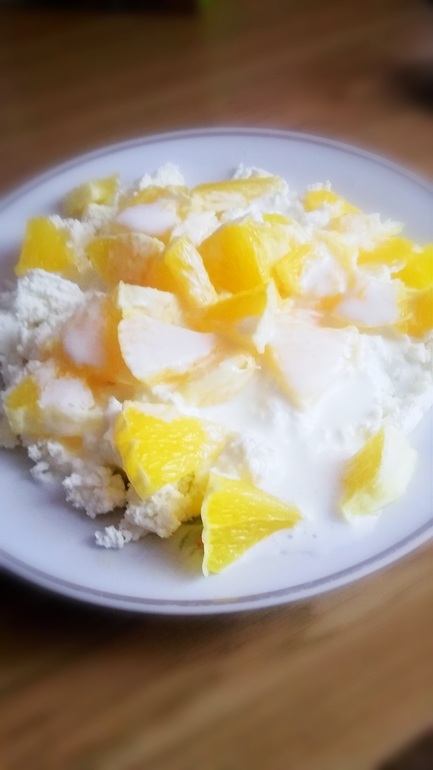 Творог 150 гр + половинка апельсина+ немного кефира для сочности