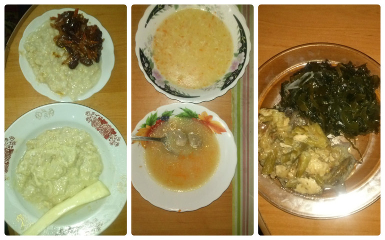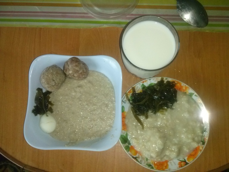 Завтрак - овсянка . у меня с тушеной фасолью с луком и морковкой. у сынули с курочкой и сыром (курочку мелко нарезала уже в кашку)))