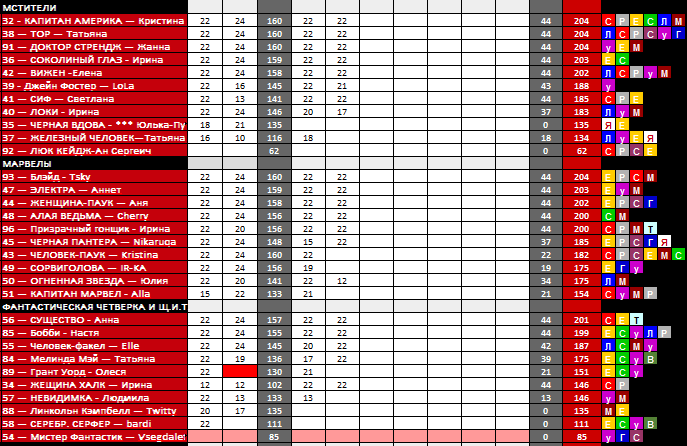 Всем добрый вечер! 84- Мелинда Мэй. Пп-12, спорт-0 (не успела(((), джокер -4, уход-1. Итого-17.