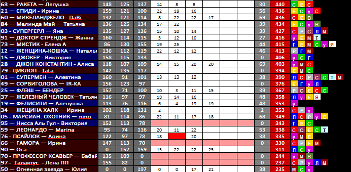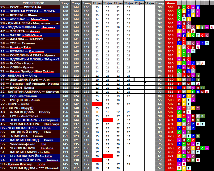 44 Женщина-паук ПП - 10 (минус БЖУ), спорт - 0 (не успела), джокер - 4, уход - 1 (крем). Итого: 15. Перчик пусть опять оранжевый будет