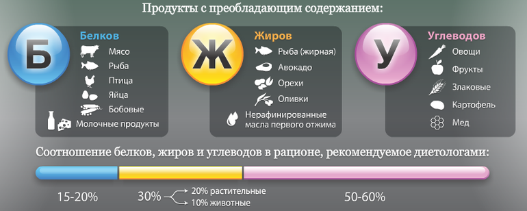 Чтобы рассчитать белки, жиры, углеводы для похудения, необходимо учесть, что 1 грамм белка имеет калорийность в 4 ккал, у углеводов калорийность та же, а вот у жиров она более чем в 2 раза выше - 9 ккал на 1 грамм. Количество углеводов в день должно составить 40% от общей массы потребленной пищи, белков - столько же, а вот жиров - всего 20 %.