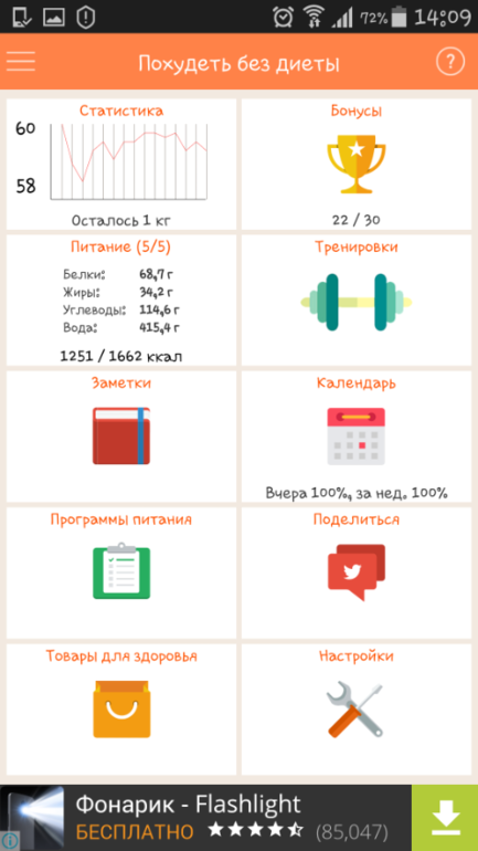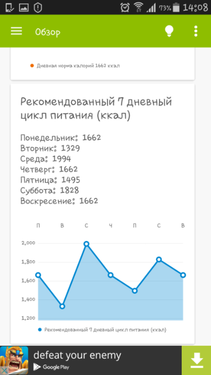 База продуктов там скудная, да и интерфейс мне показался не очень удобным, но зато есть чудо вещь - планировщик питания на неделю. Вот это лично для меня стало большой находкой. Смысл в чередовании нормы калорийности по дням. Раньше, когда я считала калории и бжу каждый день, норма всегда была одна и та же, а теперь каждый день она у меня разная. Теперь я знаю, что вторник у меня "голодный день", готовлюсь заранее, выбираю что-то нежирное, больше фруктов и овощей, чтобы не быть голодной целый день, зато среда день обжираловки) могу себе позволить очень многое. Психологически мне так легче, я не чувствую себя несчастной и ограниченной, баланс БЖУ я уже не соблюдаю, вес прекрасно уходит просто на дефиците калорий. Есть мнение, что чит милы, дни обжорства раз в неделю, обманывают организм, не дают обмену веществ замедлиться, перейти на энергосберегающий режим, и похоже со мной это работает.