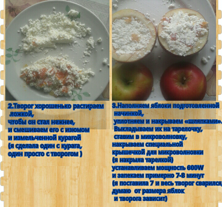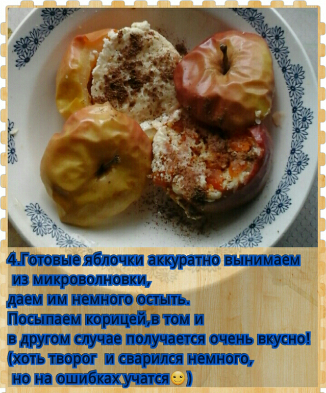 У меня микроволновка стоит на подогреве(не знаю градусы). Яблоки запекаются за 2 минуты до мягкого состояния(хоть внешне оно сначала выглядит круглым, но при остывании морщится как у вас). Вот чтоб творог не сварился до резины, сначала яблоко полторы минуты греете потом быстро ложкой ставите в яблоки творог и на 30 секунд снова включаете. И остыть.