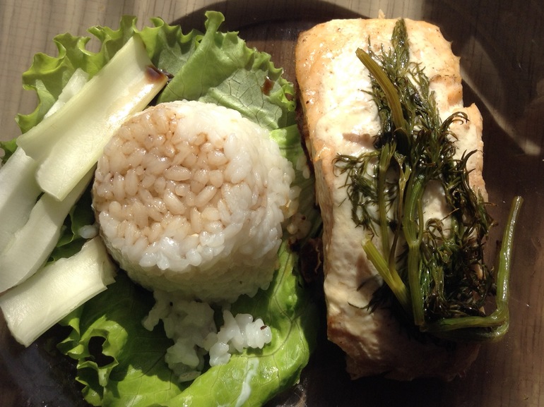 Ужин сегодня ранний(4 часа): рис( капля бальзамического уксуса), семга( с 1ч.л. Йогурта,укропом),листья салата, немного сельдерея( неделю назад о нем даже слышать не могла, сейчас понемногу добавляю, привыкаю к вкусу)