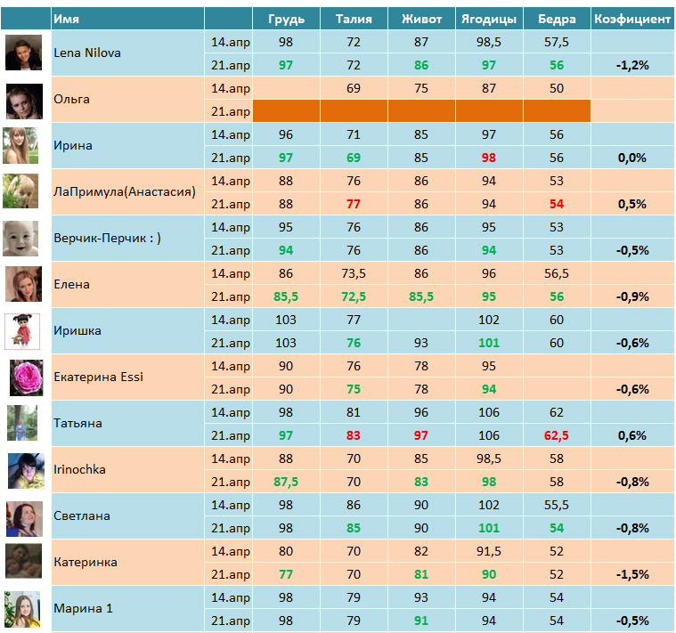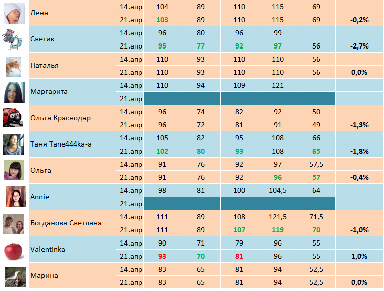 А вот у меня весов в четверг не было. Сейчас я уехала от мамы из Твери и приехала в деревню под Великим Новгородом. Мой добрый муж купил мне утром весы, специально для марафона (хотя мог бы и домашние привезти)). Так что свой результат добавлю завтра)