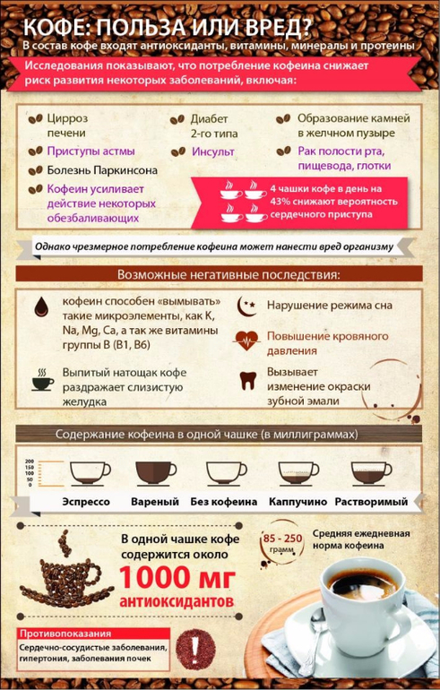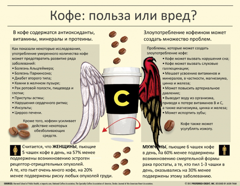 Много писать про пользу и вред кофе я не буду, но приведу парочку понятных инфографик. Причем вы понимаете, что речь пойдет только о натуральном кофе. Растворимый в моем понимании - это и не кофе вовсе)