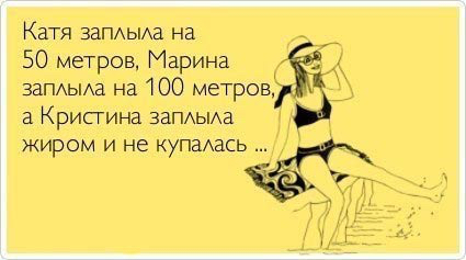 Желаю каждой из нас не быть "Кристиной", которая заплыла жиром и не смогла искупаться, не ждать конца марафона и диеты, чтобы потом наброситься на гадости и набрать все лишние кг обратно, ну и, естественно, чтобы к осени наши мужья и пессимисты, и оптимисты видели нас исключительно здоровыми, похудевшими и посвежевшими!))) и чтобы шорты и майки мы могли одевать без стыда, а наоборот лишь с радостью и гордостью за своё тело!)
