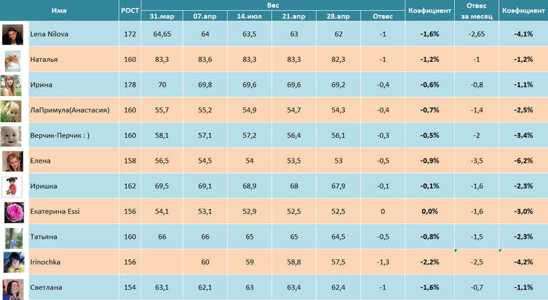 Итак в этой таблице видно кто и сколько скидывал веса за месяц.