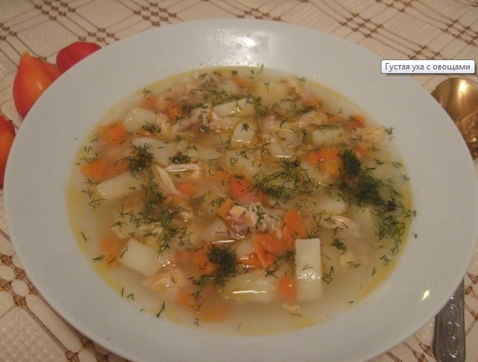 - Добавить очищенную и порезанную крупными кусками рыбу, перец, лавровый лист и варить в течение 10 минут.