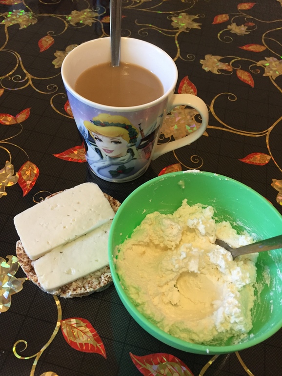 Вес свой я не знаю, не взвешивалась ещё, так как весов у меня нет. Больше всего конечно удручает живот((( моё меню на сегодня. Творог весь не осилила, бутер с сыром и вкусным кукурузовым хлебцом