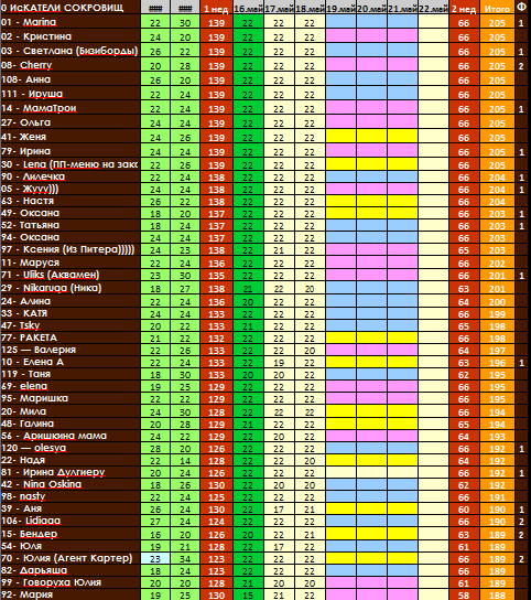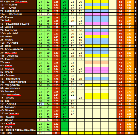 Таблица ... фукси - те кто за Ларой, синий - за Инди, желтый - за Биаром....![]()