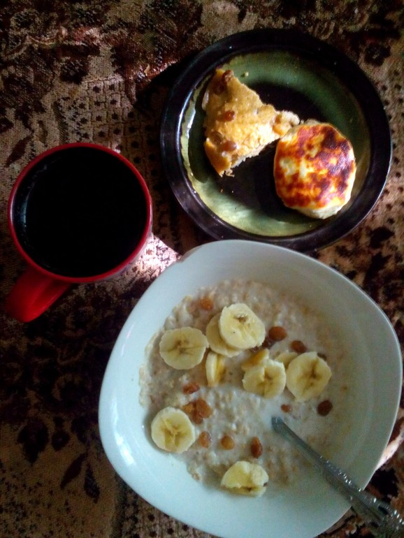 Наши менюВот такой вот вкусный, сытный и полезный завтрак получился у меня сегодня)) Овсянка на молоке пополам с водой с бананом и изюмом, сырничек, запеченный в духовке и кусочек шарлотки из молотой овсянки. Кофе с корицей. Ни грамма сахара: вся выпечка со стевией) Все вместе на 430 ккал. БЖУ 21.8/19.5/65.3