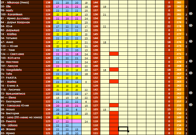 Простите за опоздание!!! Был перелет на родину с 2 мя спиногрызами. Джокера конечно нет, но спорт минимальный был. ПП-12, уход-1, джокер -0, спорт - 2. Итого 15.