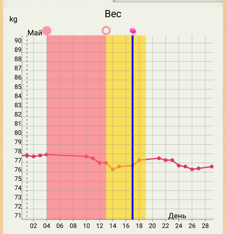 Весь месяц вес опять скакал, но в целом стабильно вошла в 76 и из нее почти не выскакиваю.