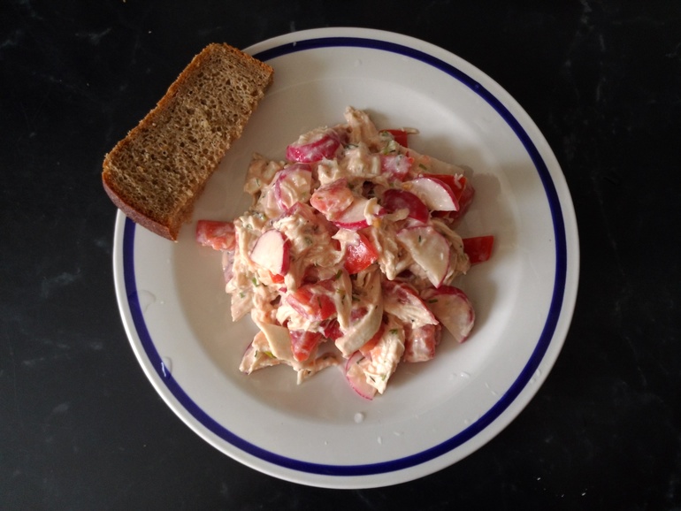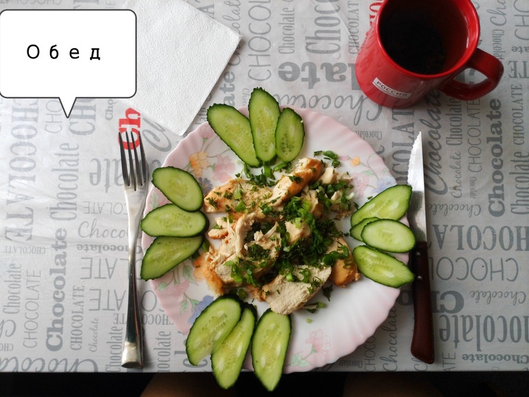 Обед: салат из вареной грудки, помидор, редиса, укропа, заправленный йогуртом малой жирности, добавила немного чеснока+чай
