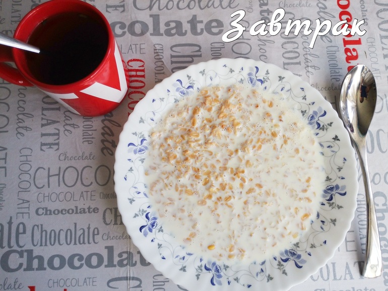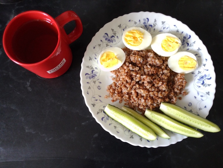 Завтрак: гречка+2 яйца+огурец+черный чай