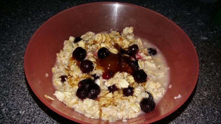 Всегда один и тот же: овсянку заливаю кипятком, добавляю ягоды (клубника или смородина) плюс ложка меда.