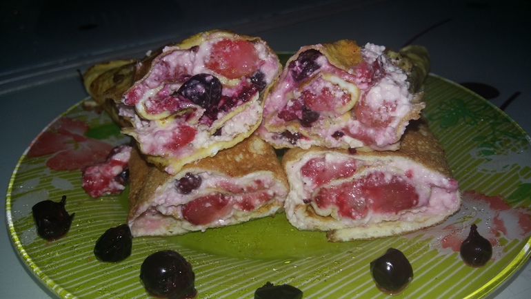 Второй завтрак. Он бывает редко, так встаю поздно. Это может быть творог или вот сегодня овсяноблин с творогом и ягодами