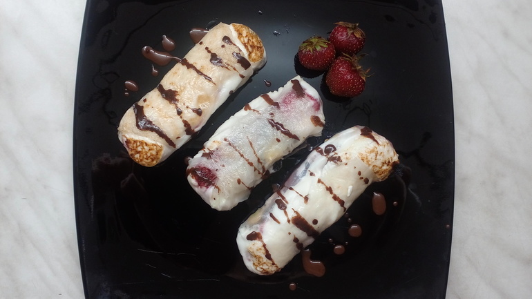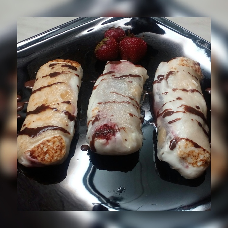 Рисовую бумагу опустить в теплую воду на 10-15сек. Она должна стать мягкая. Кладем ее на полотенце (лучше снимать) далее кладем рикотту, клубнику, киви - порезать на кружочки (можно яблоки, груши и тд) заворачиваем ролл. Слегка обжариваем на сливочном масле. Хотя этого можно и не делать. Мне больше жареные нравятся. Растапливаем шоколад в микроволновой печи. Добавляем сливки, перемешиваем. Поливаем роллы и наслаждаемся😻