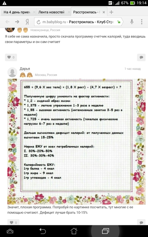 655 + (9,6 * 50) + (1,8 * 163) - (4,7 * 28)= 1296'8 * 1'55 т к тренировки 3раза в неделю' кардио в свободные от тренировок дней' двое активных детей и кормление грудью... получается 2010'04 кал в сутки. Для набора массы какой процент нужно брать? 15 - 20 наверное' получается 2412... и тот калькулятор так посчитал. Илм я не правильно считаю?