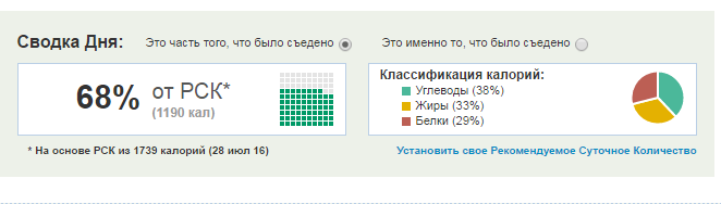 Это мне так программа считает, я сама сейчас по формуле сяду и подсчитаю, я ввела просто соотношение: у б ж - 50-30-20. Везде написано, что такое соотношение в процентах, чтобы похудеть.