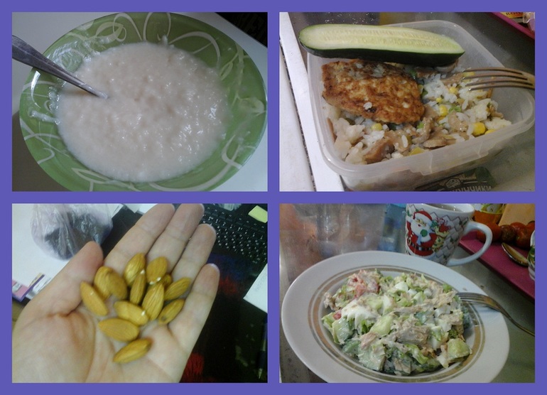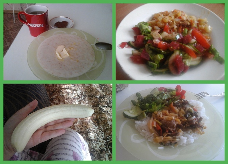 обед(фото в правом нижнем углу): рис белый отварной, овощное рагу(кабачок, баклажан, лук, морковь, помидор) с грибами и куриной грудкой, ов. салат