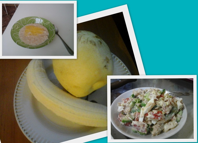 обед: салат из огурца, помидора, лука, перца, листьев салата, яйца, тунца в с.с., под соусом( нат. йогурт + петрушка + чеснок + горчица).